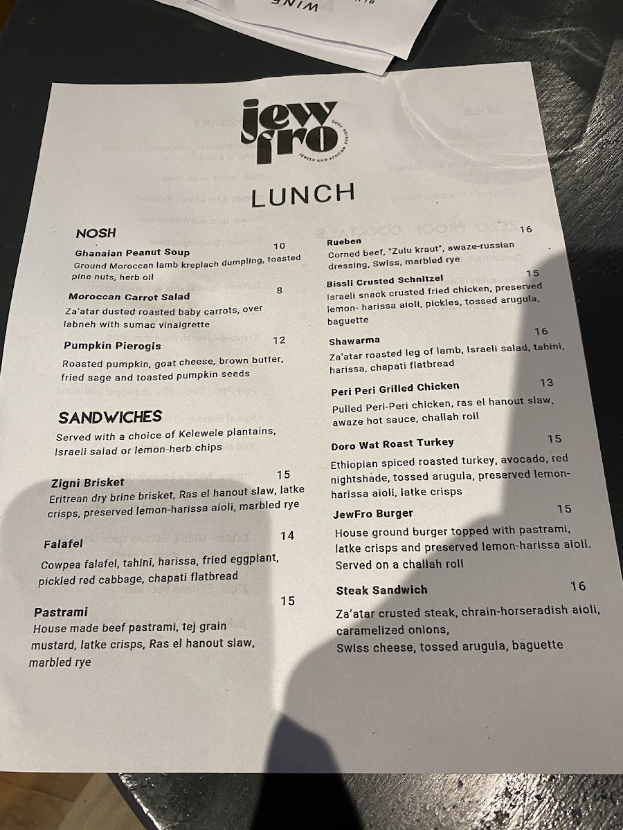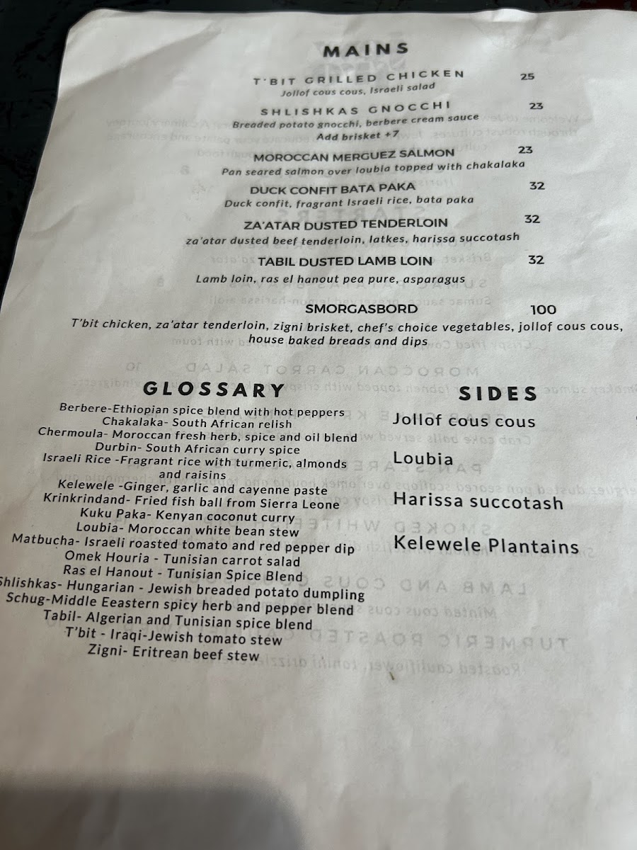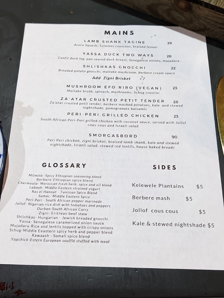 Peri Peri chicken, zigni brisket, braised lamb shank, kale and stewed nightshade, Israeli salad, stewed red lentils, house baked breads